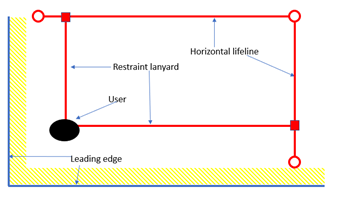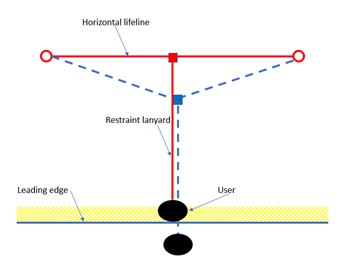 See example (pictured) where the user is facing 2 leading edges and to maintain restraint has been given 2 horizontal lifelines and 2 adjustable restraint lanyards which would require continued adjustment to maintain restraint in relation to their position.