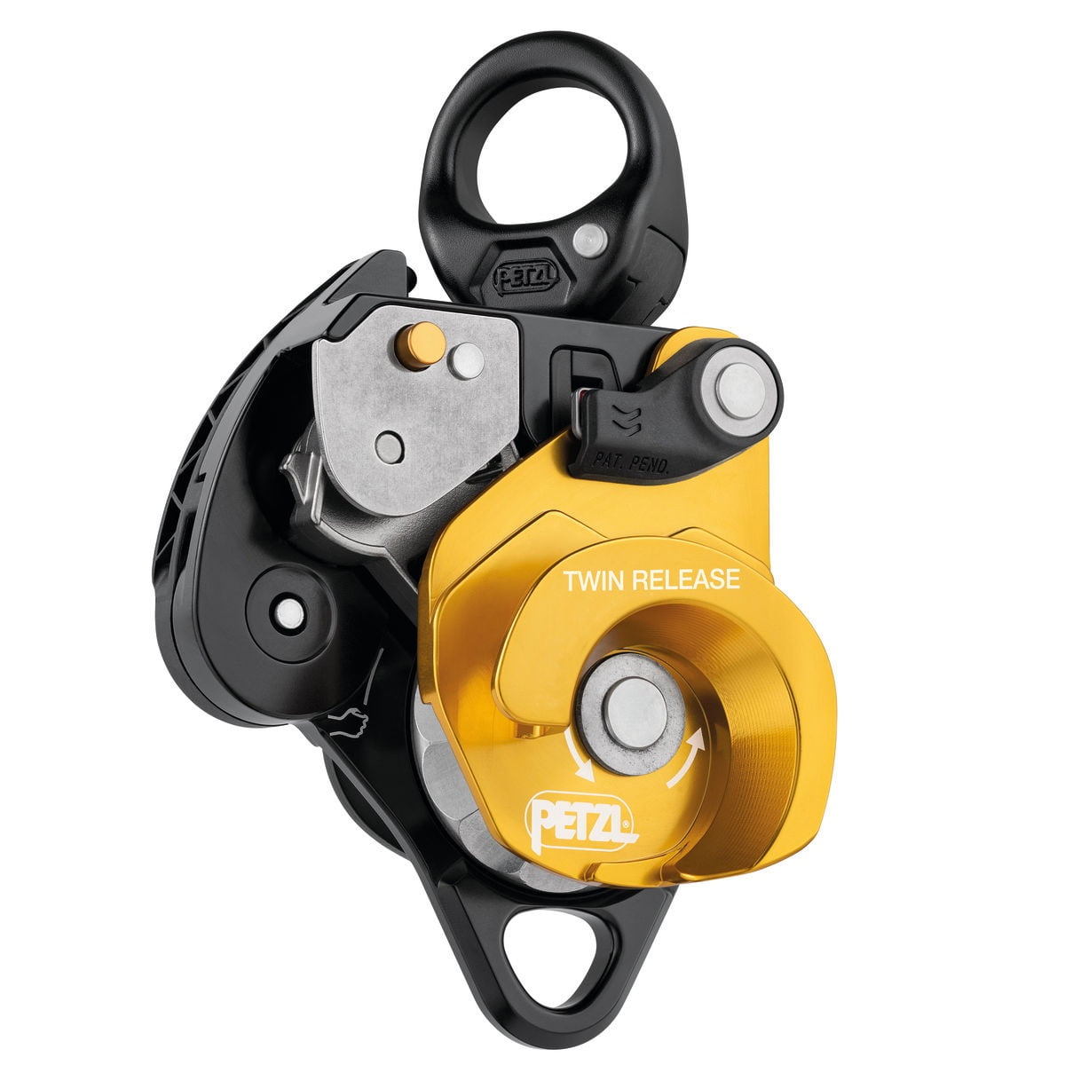 Releasable, the TWIN RELEASE progress capture pulley is designed to set up 4:1 haul systems for work in confined spaces or for technical rescue. Releasing the cam is possible with the ergonomic handle. The brake integrated into the moving side plate and the main faceted sheave with single-direction rotation, offer additional braking and better control when lowering heavy loads. The two sheaves provide excellent hauling efficiency. The swivel facilitates operations, allowing the pulley to be oriented under load and direct connection of carabiners, ropes, or slings.